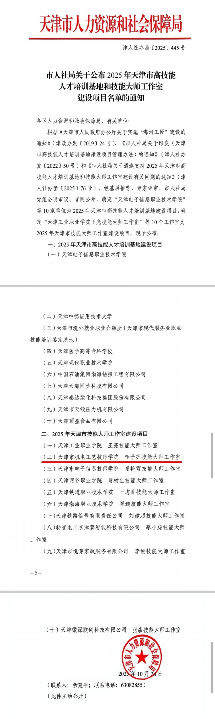 近日,天津市人社局下發(fā)了《關(guān)于公布2025年天津市高技能人才培訓(xùn)基地和技能大師工作室建設(shè)項(xiàng)目名單的通知》,百利裝備集團(tuán)所屬天津市機(jī)電工藝技師學(xué)院(以下簡稱“工藝學(xué)院”)再次獲批天津市技能大師工作室——李子齊技能大師工作室。至此,工藝學(xué)院已建成3個(gè)天津市技能大師工作室。