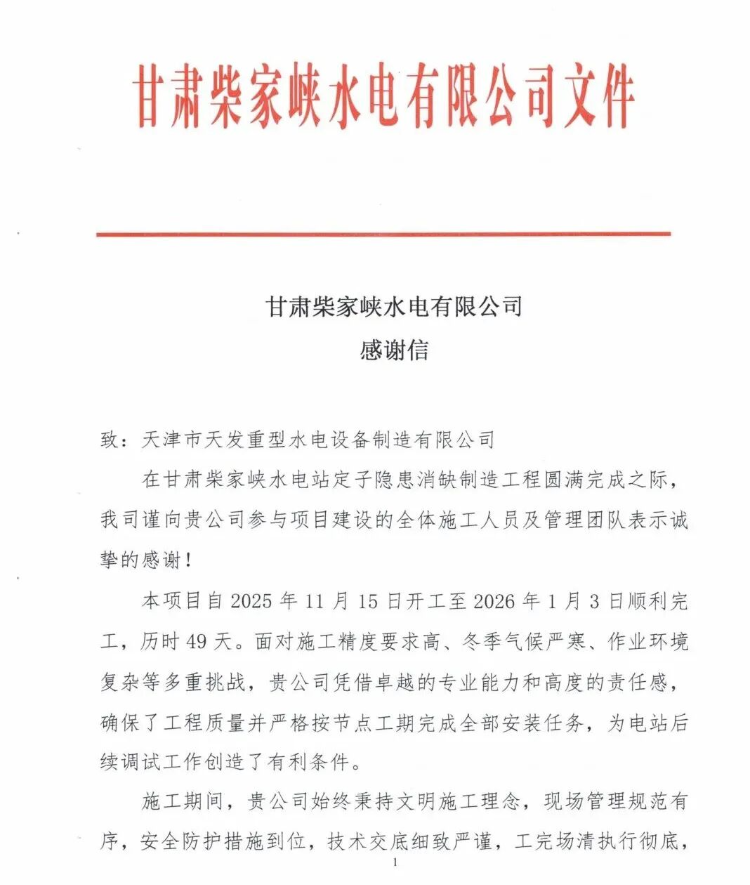 甘肅柴家峽水電站作為國家重點水電工程,四臺轉(zhuǎn)輪直徑7.2米、單機容量24MW的燈泡貫流式水輪發(fā)電機組在區(qū)域電力供應(yīng)、防洪灌溉等方面發(fā)揮著不可替代的綜合作用。為確保項目順利推進(jìn),天發(fā)水電公司組建了專業(yè)技術(shù)團隊駐扎現(xiàn)場開展工作,充分發(fā)揮技術(shù)協(xié)同優(yōu)勢,結(jié)合老舊機組的結(jié)構(gòu)特點和實際運行情況,精準(zhǔn)把控技術(shù)適配性和運行安全性,攻克多個技術(shù)難題。改造后的定子設(shè)備不僅消除了原有安全隱患,降低了機組能耗,也為電站后續(xù)長期安全運行夯實了技術(shù)基礎(chǔ)。此次改造項目的圓滿完成,得到了業(yè)主方的高度認(rèn)可和滿意評價,特別送達(dá)感謝信對天發(fā)水電公司的專業(yè)能力和高效服務(wù)表示感謝。